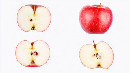 Fresh red apples, one whole apple and three sliced apples on a clean white background, showcasing the fruit s natural texture and vibrant color Ideal for health and food concepts