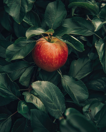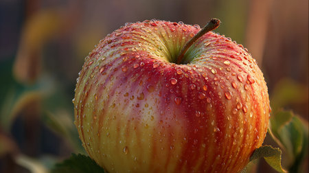 Fresh Red Apple with Water Droplets Gleaming in the Morning Sunlight
