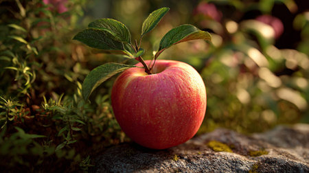 Fresh Picked Apple Resting on Rock, Surrounded by Natural Greenery