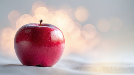 Fresh red apple resting on soft fabric with blurred bokeh background creating a warm atmosphere