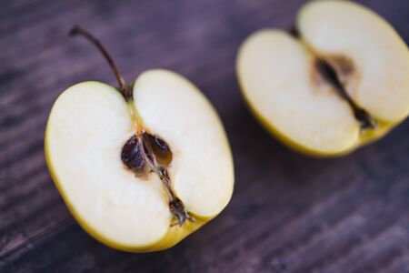 healthy plant-based food ingredients concept, apple halves on wooden table