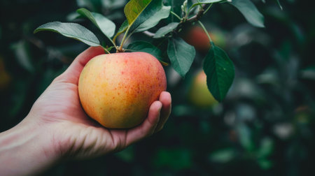 A close-up of a hand picking a fresh apple from a tree, representing harvesting, freshness, and organic farming.