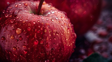 A vibrant close-up shot of a fresh red apple, glistening with water droplets, emphasizing its freshness and natural appeal.