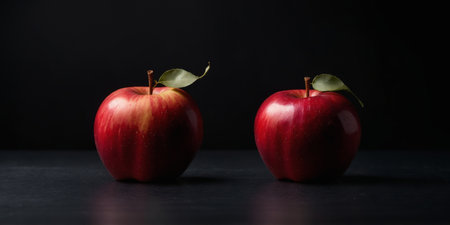 A fresh red apple in spot light with reflecting water drops on it, blurry black background, long exposure photography