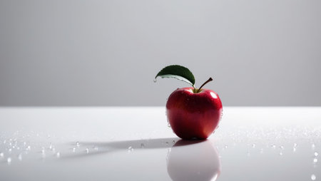 A vibrant red apple adorned with glistening water droplets sits elegantly against a soft background, embodying the essence of freshness and health.