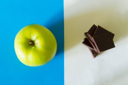 Fresh red apple top view on navy blue and yellow background banner with copy space
