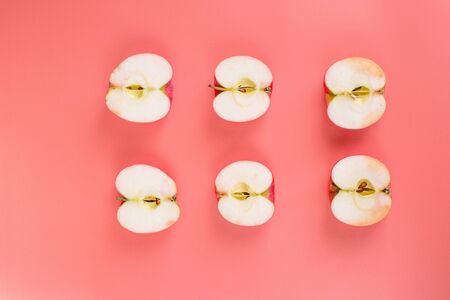 Ripe Apple halves on pink background. Healthy food concept. Fresh juicy apples