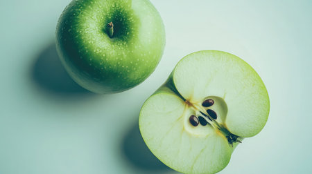 A vibrant green apple sits alongside a halved version, revealing its seeds and juicy interior, perfect for promoting health, nutrition, and organic lifestyle choices.