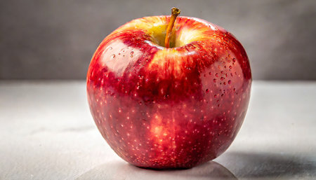A vibrant red apple rests elegantly against a soft gray backdrop, showcasing its shiny surface and inviting color, ideal for promoting healthy eating and vibrant lifestyle choices.