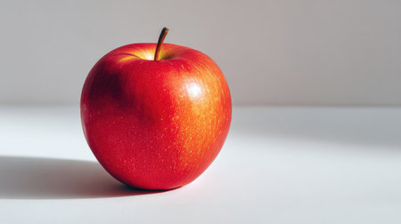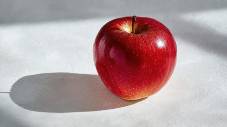 A bright red apple resting on a clean white surface, showcasing its natural color and texture. Ideal for health and nutrition themes in creative projects.