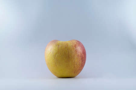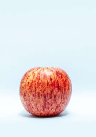 One yellow-red ripe apple on a blue background. View from the front. Horizontal orientation.