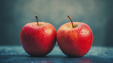 Close-up of two red apples with water droplets on their surface, placed against a dark background, symbolizing freshness, health, and natural beauty.