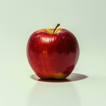Close-up of a fresh red apple against a gradient background. The vibrant color and natural texture emphasize the apple's freshness and appeal.