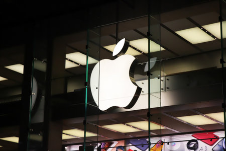 DUSSELDORF, GERMANY - APRIL 14, 2017: Apple sign on the Apple store in Dusseldorf. Apple is an American multinational technology company headquartered in Cupertino, California