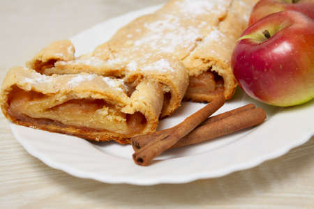 Apple strudel on a light background, top view. Traditional pastries