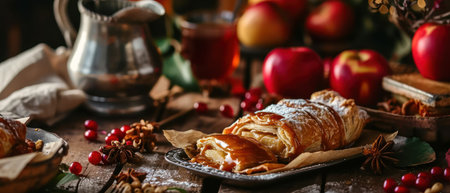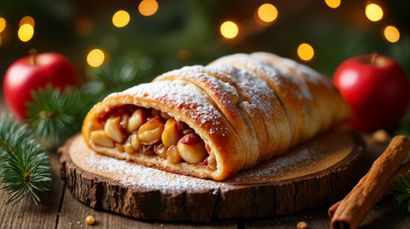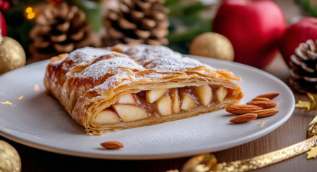 A beautifully presented apple strudel bakes with golden layers of pastry and sweet, spiced apple filling, garnished with powdered sugar and surrounded by holiday decorations and warmth.
