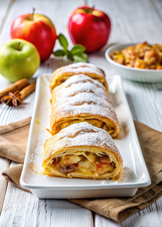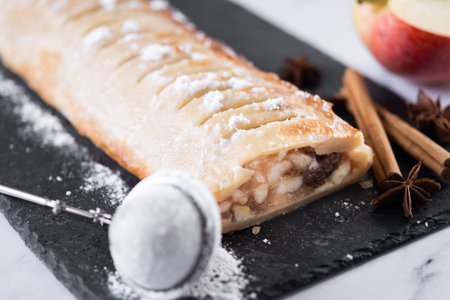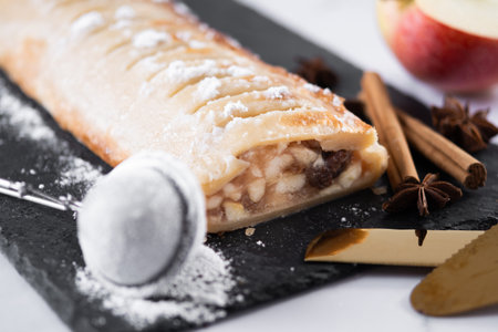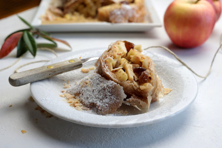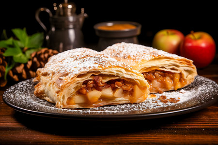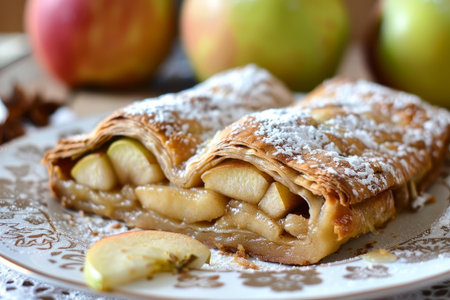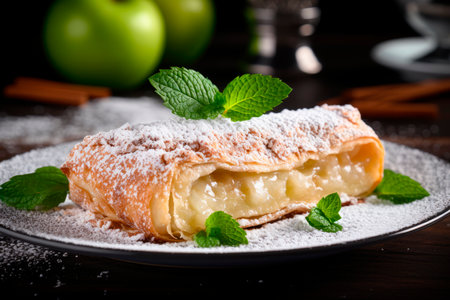 Delicious apple strudel with powdered sugar, served on a decorative plate