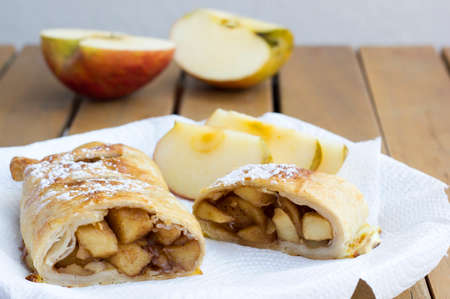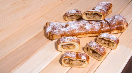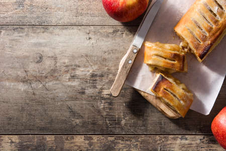 Traditional homemade apple strudel on wooden table.