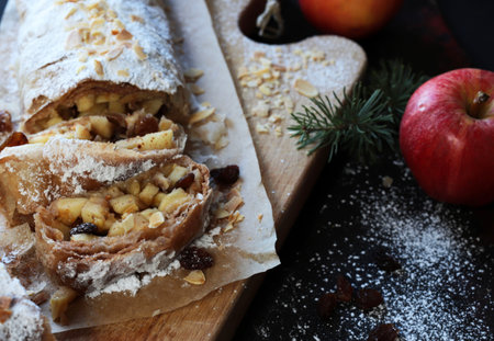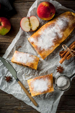 Home autumn, summer baking, puff pastries. Apple strudel with nuts, raisins, cinnamon and powdered sugar. On a wooden old rustic table. Sliced, with ingredients. Copy space top view