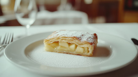 Slice of apple strudel with visible fruit filling, powdered sugar and cinnamon. Warm cozy dessert presentation suitable for food blogs, recipes, restaurant menus and seasonal food
