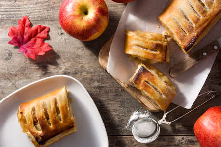 homemade apple strudel on the wooden table with apples