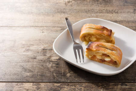 Traditional homemade apple strudel on wooden table
