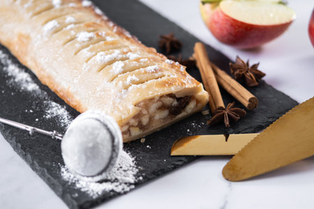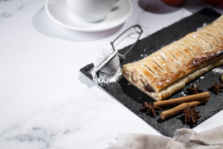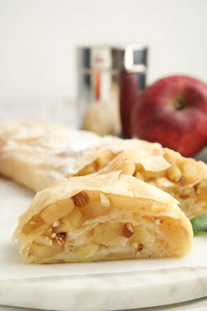Homemade apple strudel on white marble background. Traditional Austrian and German sweet
