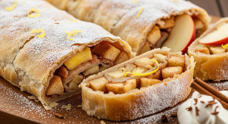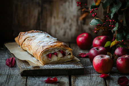 Deliciously baked apple strudel served with sliced apples and berries on a rustic wooden table