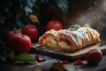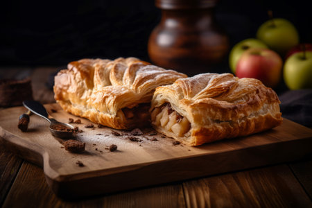 Apple strudel pastry on wooden board. Traditional delectable crust fruity baked cake. Generate ai