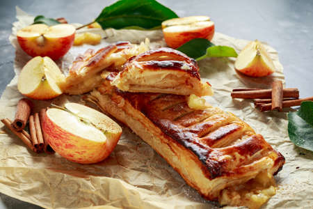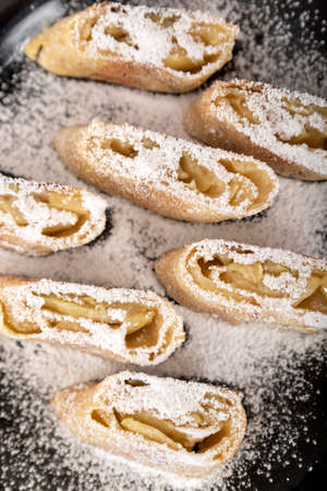 Strudel Apple and sugar powder. Biscuit from the puffed Test on the Gray Background. Dessert with Fruits.Copy space for Text. selective focus.