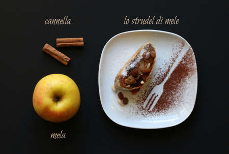 Apple strudel on a dark background, top view. Traditional autumn pastries