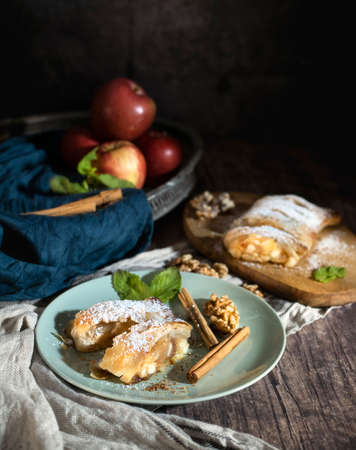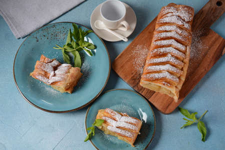 Austrian strudel with mint and with powdered sugar on a plate. Cake with apple jam