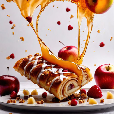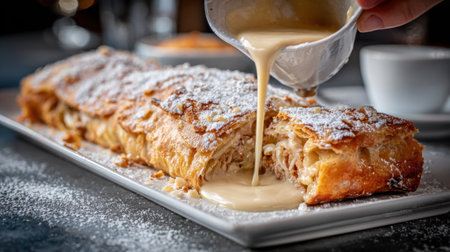 Enjoy the visual delight of a freshly baked apple strudel, drizzled with rich cream sauce. This image captures the essence of indulgent desserts perfect for any occasion.