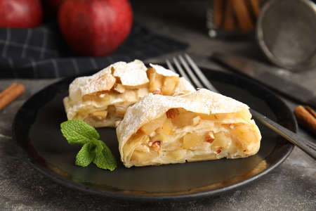 Delicious apple strudel with almonds, powdered sugar and mint on gray table