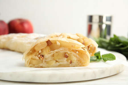 Delicious apple strudel with almonds and mint on white board, closeup