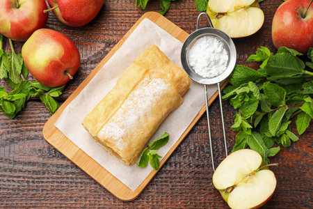 Delicious apple strudel with powdered sugar and mint on wooden table, flat lay