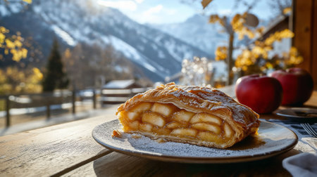 AI-generated presentation of a rustic plate showcasing delicious freshly baked apple strudel