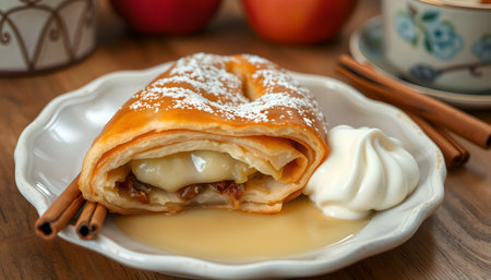 Apple strudel with cinnamon and cream on a wooden table.
