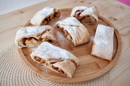 Flaky, golden brown apple strudel slices topped with powdered sugar on a wooden tray. a tempting treat for dessert lovers.