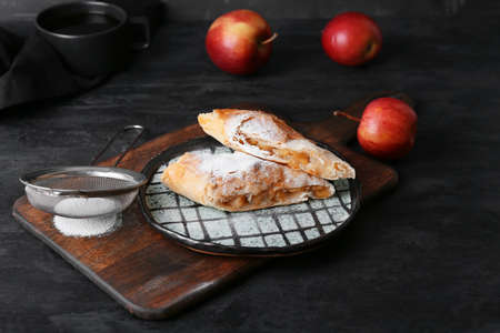 Plate with pieces of tasty apple strudel on black background
