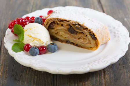 Apple strudel with ice cream and berries.