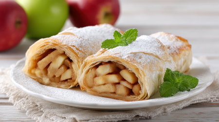 Delicious apple strudel slices with golden flaky pastry, filled with apple pieces, sprinkled with powdered sugar, and decorated with fresh mint leaves on a rustic wooden table.