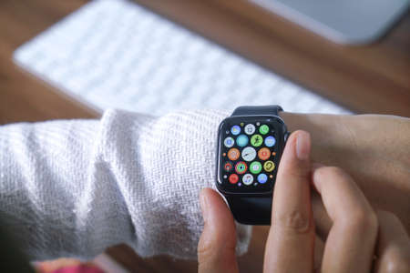 Bali Indonesia June 2, 2020 : female hands using with apple, Apple Watch is a line of smartwatches designed, developed, and marketed by Apple Inc.