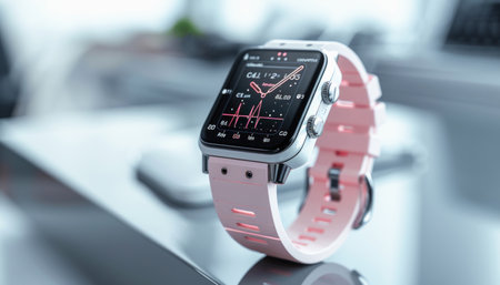 A pink band smart watch is displayed on the table, showcasing its elegant design and color to the viewers