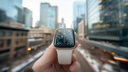 Man's hand holding a smart watch with a city view on the background