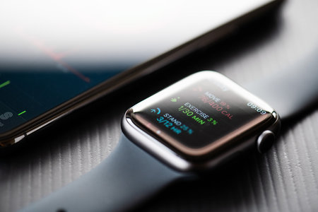 Apple Watch 5 with iPhone 11 in blurred background. New Apple watch & iPhone releases are widely followed event every year