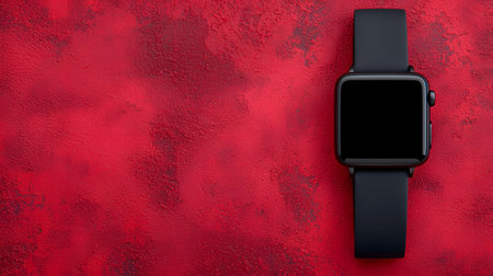 A sleek black smartwatch with a blank display rests atop a vibrant red textured surface, creating an elegant contrast. The atmosphere feels contemporary and bold.