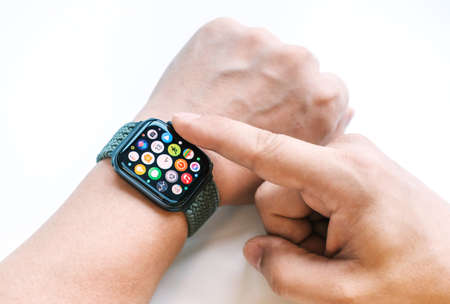 Close up hand using smart watch, Apple Watch with bokeh background : Bali Indonesia 4 Maret 2021