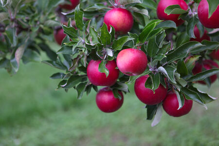 large ripe apples clusters hanging heap on a tree branch in an intense apple orchard. Dewdrops. Vitamins. Vegetarian