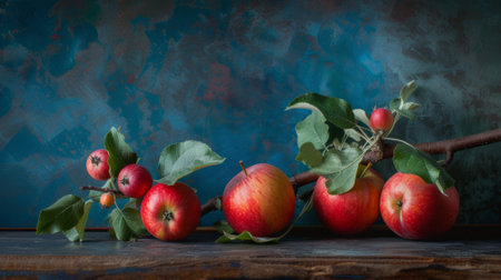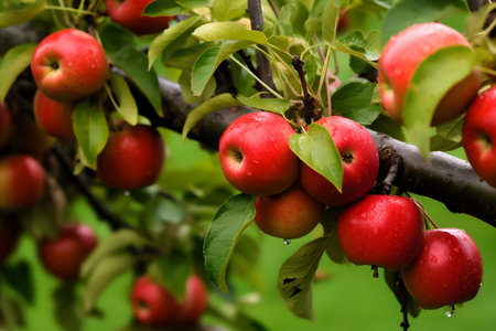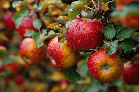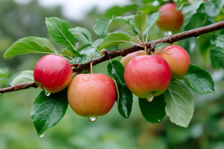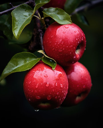 Red apples dangle from a green branch, shimmering with droplets of dew. This vibrant sight captures the freshness of early morning in an orchard, revealing the beauty of nature.